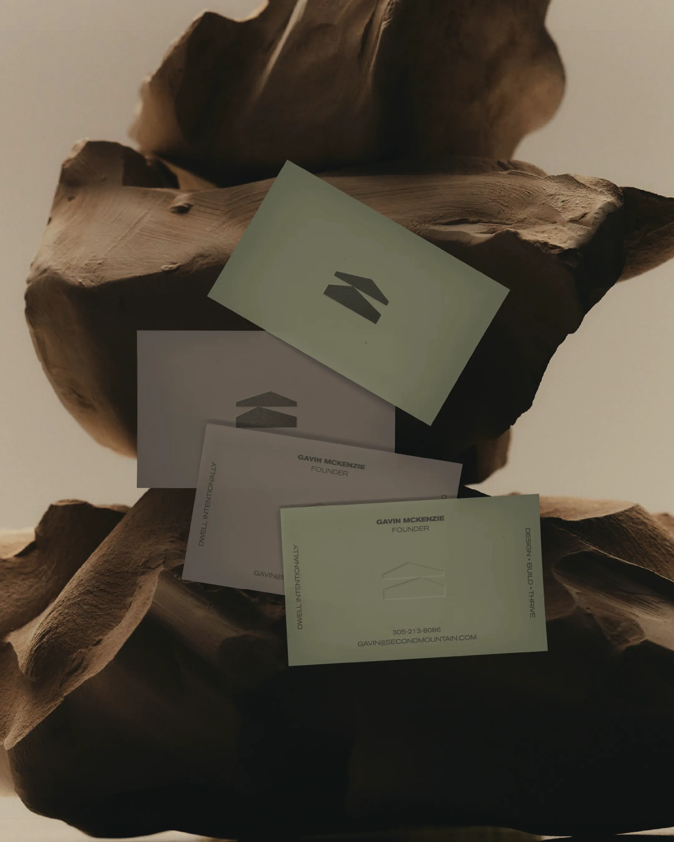 The final identity pairs clean, modern typography with an abstract geometric mark representing both mountain peaks and architectural rooflines, suggesting ascent and structure simultaneously. The neutral, earth-toned palette (moss, sky, rich browns) grounds the brand in natural materials while maintaining sophisticated restraint. Stacked typography accommodates the lengthy name across applications, and the standalone icon works beautifully for stamps, burns, and lifestyle goods. The positioning evolved from potentially restrictive "homesteading" language to the more expansive "land-connected living by design," inviting people to define their own relationship with the land while emphasizing the design-build expertise at the core.