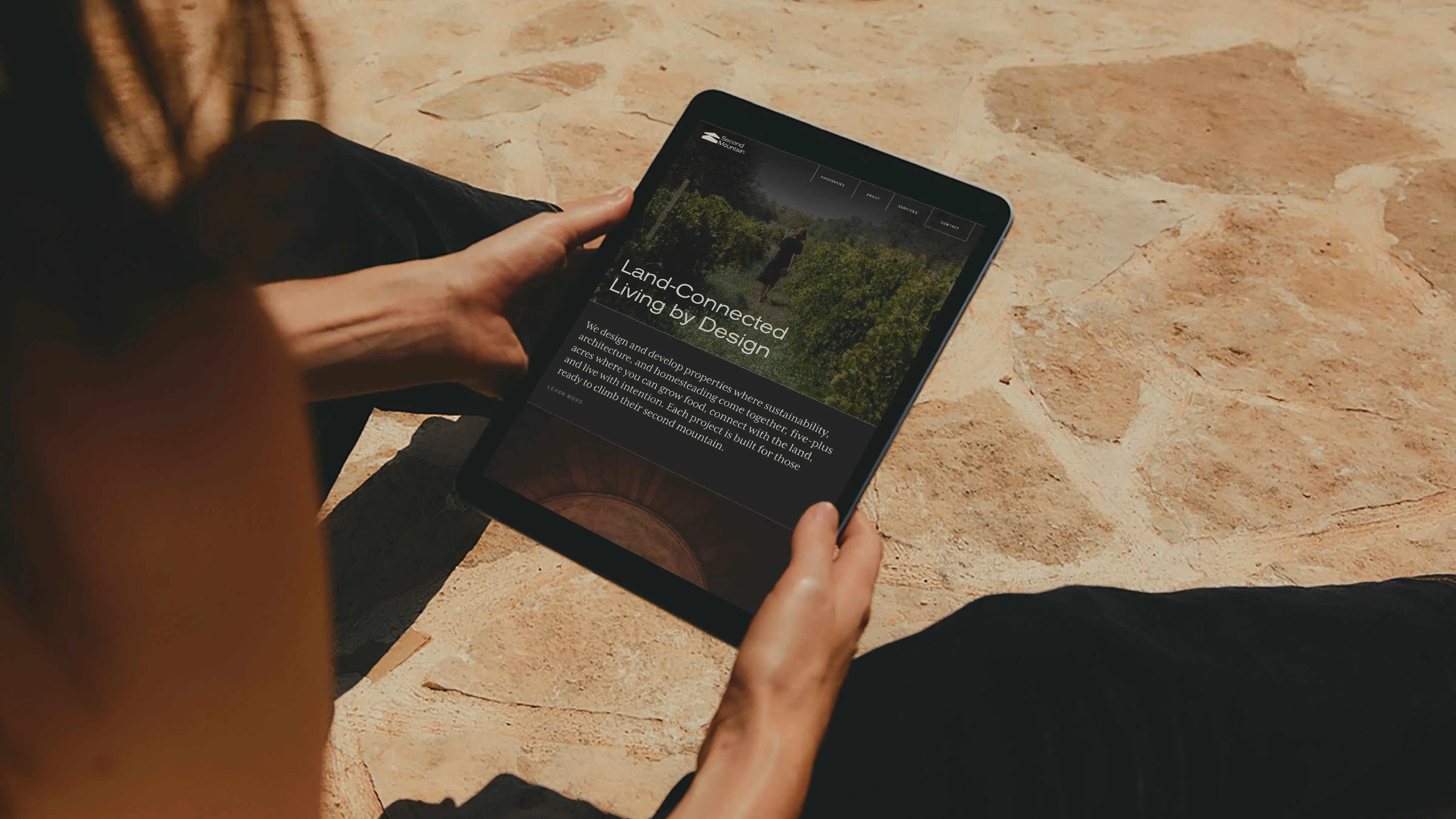 Second Mountain is a property design-build venture creating three-plus-acre homesteads in Western North Carolina. The company needed a complete brand identity that could communicate sophisticated rustic modernism while attracting urban-to-rural transplants seeking authentic, land-connected living. The brand had to work across diverse applications, from architectural presentations to apparel and fire-branded signage, while avoiding homesteading clichés and maintaining the refined aesthetic of Japanese and Scandinavian design influences.